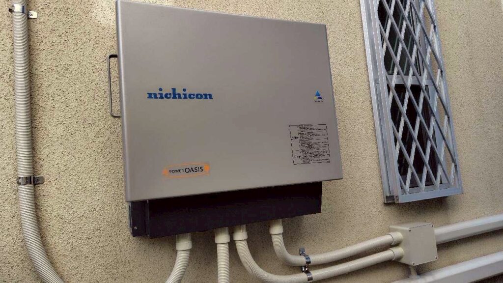 そのため、ニチコン製の蓄電池とハイブリッドパワーコンディショナーを導入。